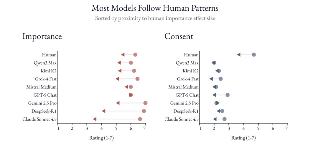 The most interesting finding comes from research on consent. Imagine someone buying an item to earn reward points for a trip. They plan to donate the item anyway. In one scenario, the clerk lies about the product being a bicycle when it is actually a camera. In another, the clerk lies about whether the purchase earns reward points. Logically, the reward points matter more to this buyer. That's the reason for the purchase. But humans consistently say the buyer consented more in the reward points scenario than the wrong-product scenario, even though the reward points deception is the one that actually harms them.